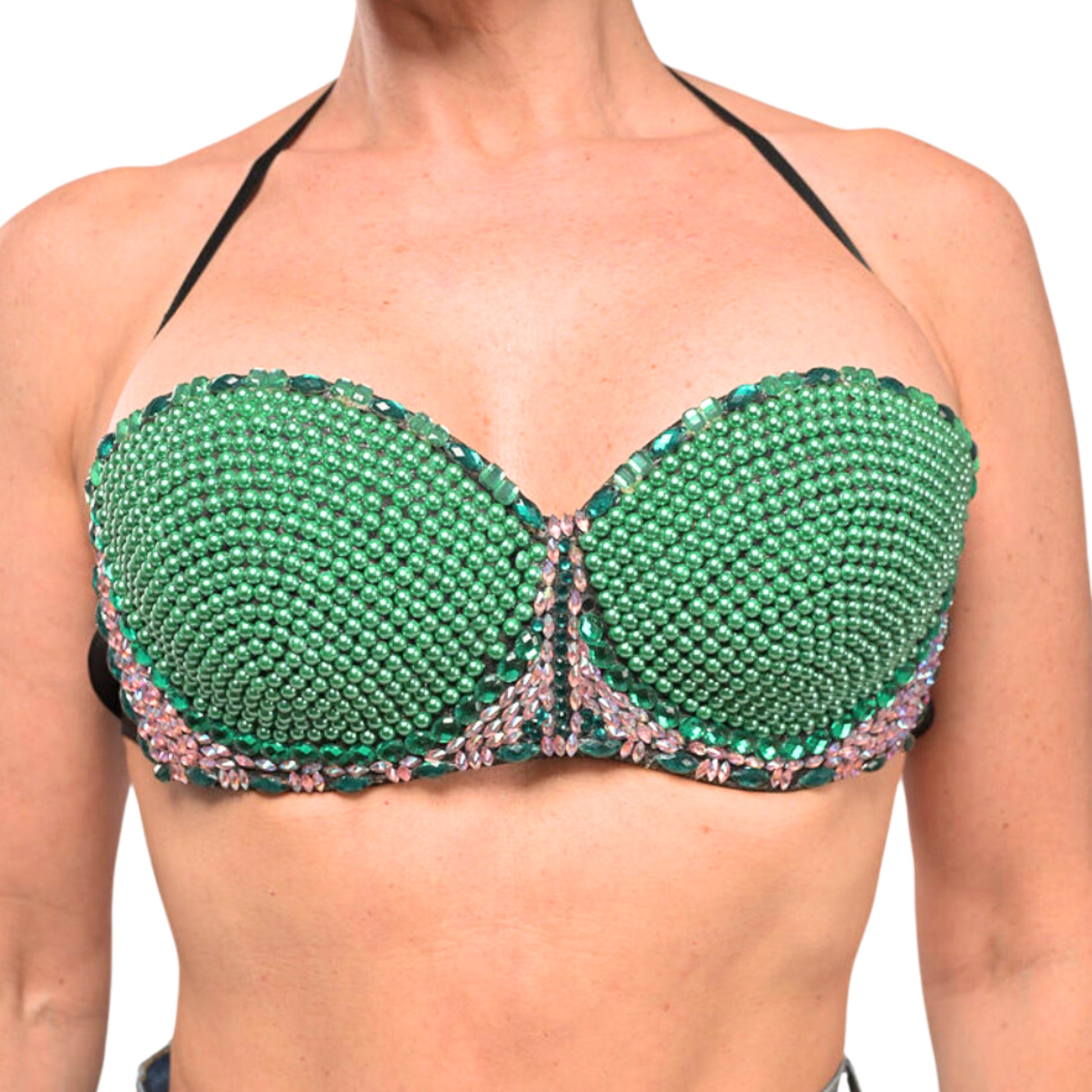 Add a touch of glamour to your wardrobe with our green top adorned with sparkling stones. The beautiful design will elevate any outfit, perfect for a night out. Made with high quality materials, this top will keep you looking stylish and confident.